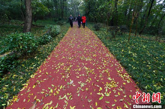 图为市民在大红色的绿道上游览。中新社发 泱波 摄