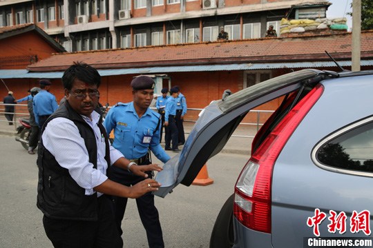 图为一辆汽车在首都加德满都街头接受安检。中新社发 符永康 摄