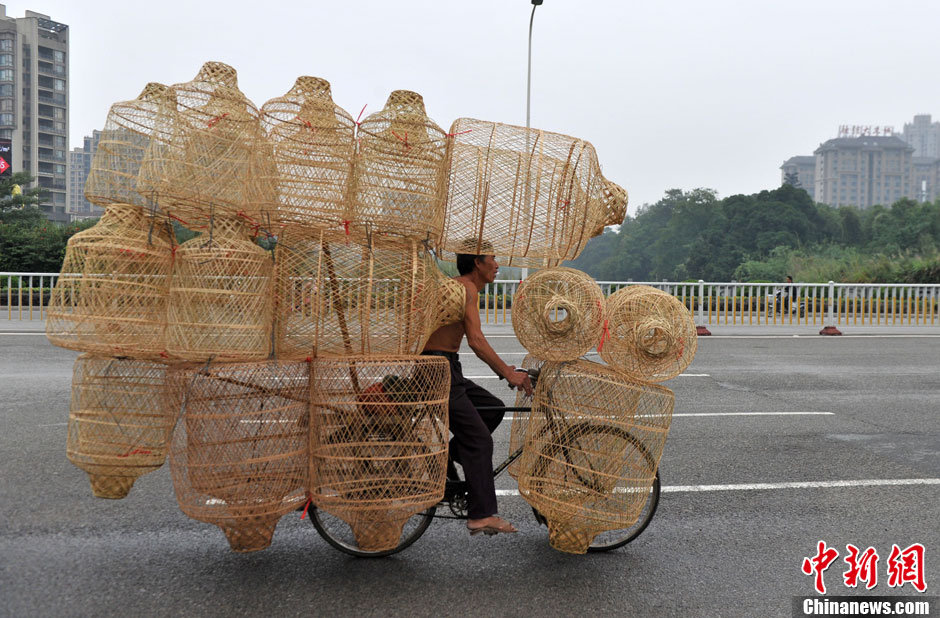 “笼人”骑车上路如杂技