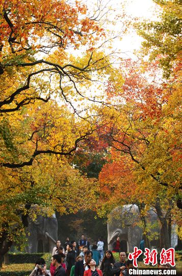 11月3日,市民们在南京东郊明孝陵石象路上欣赏秋景。中新社发 泱波 摄