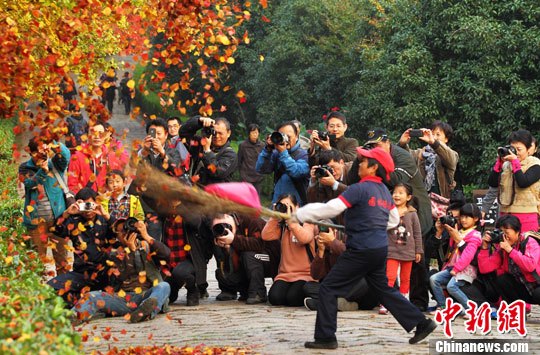 11月3日,摄影爱好者们在南京东郊明孝陵石象路上拍摄秋景。中新社发 泱波 摄