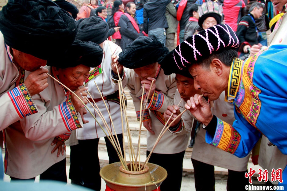 11月3日,“中国古羌城”在四川茂县开城,当地羌族民众载歌载舞喜庆“中国古羌城”开城。图为开怀畅饮咂酒。何海清 摄