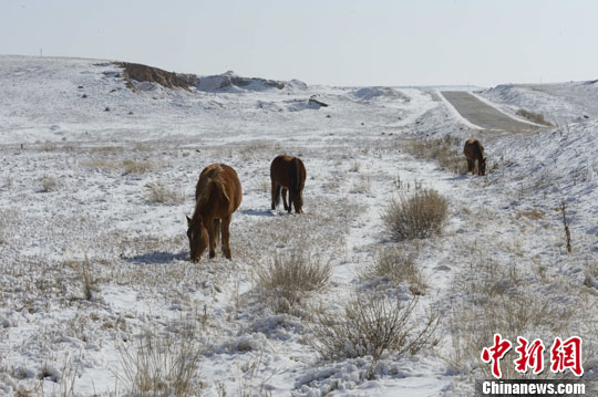 11月5日,内蒙古达茂旗境内,三五成群的马匹在雪原上走走停停,放松的吃草,昨日一场雪给大地披上银装,风景怡人。中新社发 刘文华 摄