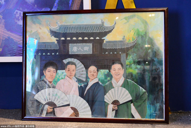 2013年11月18日,几千年来,“古代四大美男”有着多种版本,而其中以潘安、宋玉、兰陵王(高长恭)、卫玠一说流传最广。王俊英画中的《新四大美男图》中莫言、李玉刚、刘翔、陈光标则是分别以“智慧之美”、“俊朗之美”、“运动之美”、“心灵之美”入选。而《四大屌丝图》中的冯小刚、黄永玉、孙杨、史玉柱这四位分别来自中国娱乐界、艺术界、体育界和商界的四位西装革履、神态各异“屌丝”也引起了在场观众的热议。在《中秋拜月图》中,大陆“微博女王”姚晨和台湾著名综艺节目主持人徐熙娣(小S)花瓣簇拥席地而坐,在一轮圆月下默默向天祈祷,引发人们不少遐想。该画拥有者张一一表示,王俊英创造这份作品的意思,就是希望当在寄望血浓于水的两岸人民的“大团圆”。