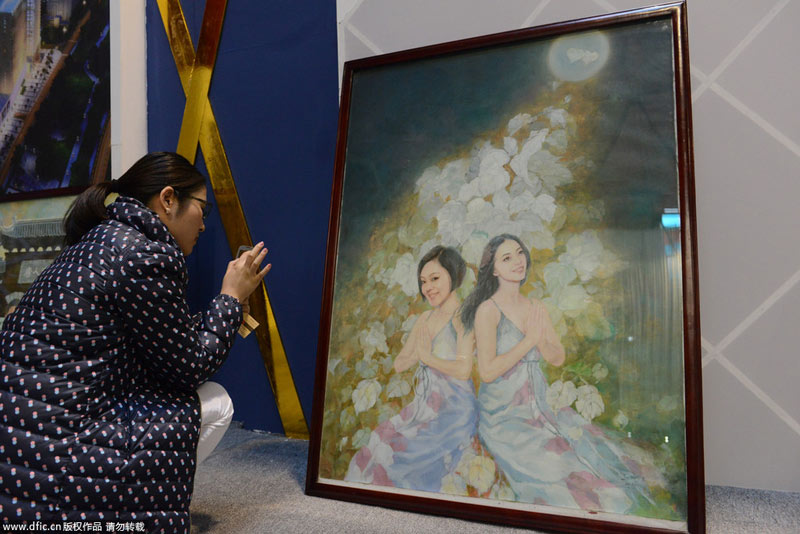 2013年11月18日,几千年来,“古代四大美男”有着多种版本,而其中以潘安、宋玉、兰陵王(高长恭)、卫玠一说流传最广。王俊英画中的《新四大美男图》中莫言、李玉刚、刘翔、陈光标则是分别以“智慧之美”、“俊朗之美”、“运动之美”、“心灵之美”入选。而《四大屌丝图》中的冯小刚、黄永玉、孙杨、史玉柱这四位分别来自中国娱乐界、艺术界、体育界和商界的四位西装革履、神态各异“屌丝”也引起了在场观众的热议。在《中秋拜月图》中,大陆“微博女王”姚晨和台湾著名综艺节目主持人徐熙娣(小S)花瓣簇拥席地而坐,在一轮圆月下默默向天祈祷,引发人们不少遐想。该画拥有者张一一表示,王俊英创造这份作品的意思,就是希望当在寄望血浓于水的两岸人民的“大团圆”。