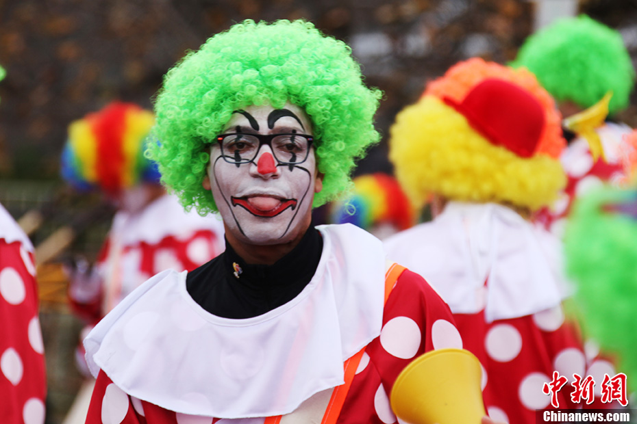 多伦多近期进入节日季,各类节庆活动目不暇给。当地时间17日中午,已经举行了超过一百年的多伦多圣诞老人花车大巡游活动在市中心举行,吸引民众积极参与。相比于一百多年前只有圣诞老人出巡的情况,现如今的大巡游,花车更加多姿多彩,创意十足,数量越来越多,各类乐队竞相亮相,异彩纷呈。图为参加巡游活动的小丑。徐长安 摄