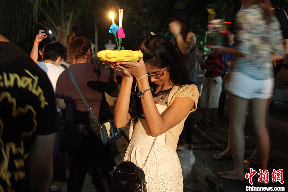 “水灯节”是一个体现泰国青年男女恋情的传统节日,水灯节当晚泰国的青年男女都要燃放孔明灯、放水灯。2013年的“水灯节”是11月17日,图为一女青年手举水灯祈福。余显伦 摄