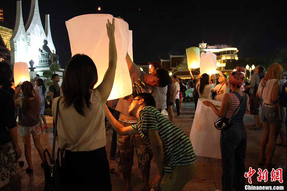 “水灯节”是一个体现泰国青年男女恋情的传统节日,水灯节当晚泰国的青年男女都要燃放孔明灯、放水灯。2013年的“水灯节”是11月17日,图为曼谷青年17日晚在繁华桥附近燃放孔明灯。余显伦 摄