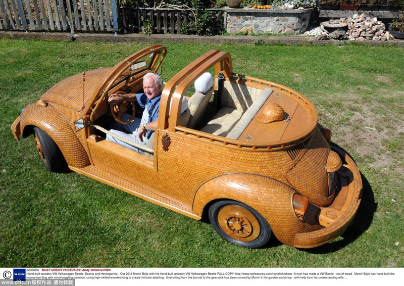 当地时间2013年11月报道,来自波黑的男子Momir Bojic在路上开车时经常受到路人羡慕又忌妒的眼光,原因是他这台全木头自制的大众“甲壳虫”车实在太抢眼了!据悉为了这辆“甲壳虫”,Momir Bojic筹划了很长时间,而从选材到完成就花了他一整年的时间,方向盘、车盖以及仪表板等等全是以1:1等比例仿造而成,而且车身做工极其精细。难怪当地举行车展时,这辆木质“甲壳虫”虽然不是参展车,锋头却盖过车展中的所有车辆!