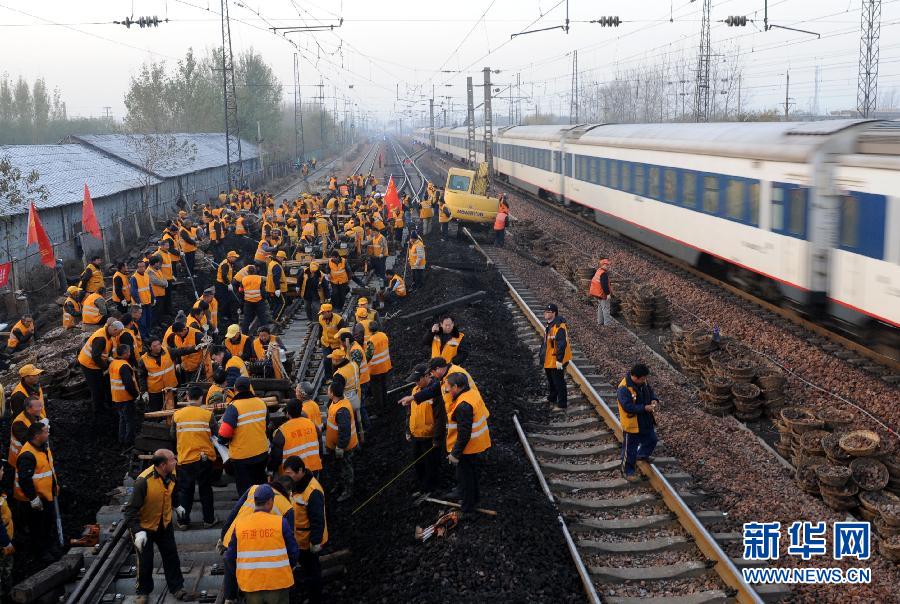 11月25日,郑州铁路局新乡桥工段施工人员在京广线汤阴站进行更换道岔作业。从11月24日至12月24日的一个月时间内,铁路部门对京广线使用多年、到达“服役”期限的道岔、钢轨等重要设备进行全面大修。为此,郑州铁路局提前编制施工组织方案,结合不同的施工项目和环境特点,实行“一点一方案”,制作施工作业时间卡控图,按照施工程序将任务分解到班组、时间细化到分钟,确保集中整修期间旅客列车安全正点。新华社记者 李博 摄