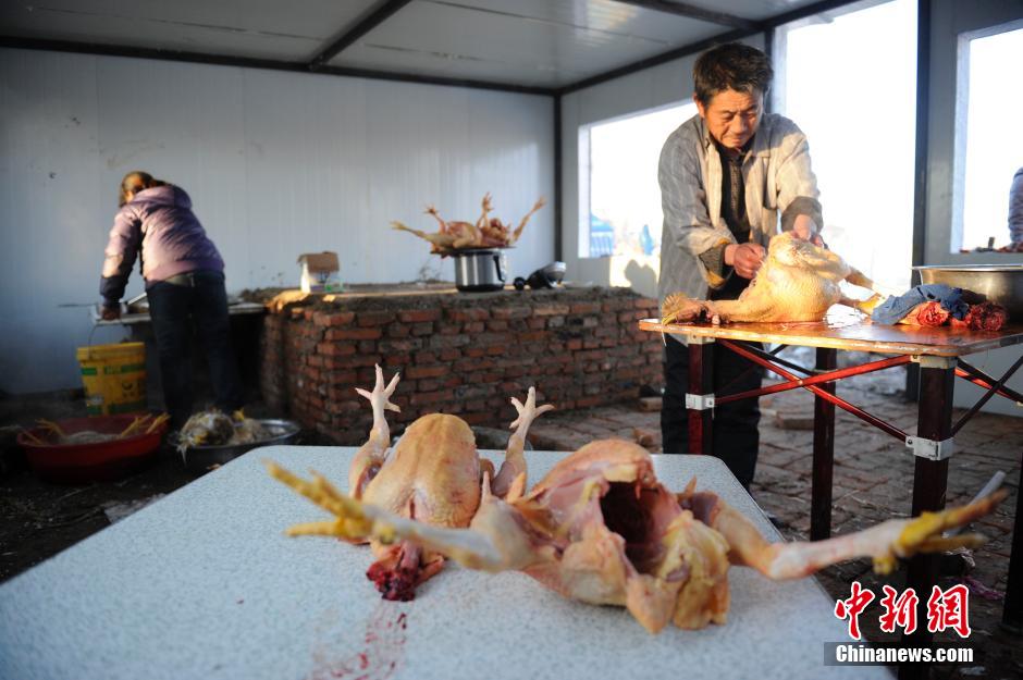 11月23日,松原市腰英吐村一户村民将自家饲养的家禽全部宰杀。据了解,23日清晨前郭发生的5.8级地震,令当地房屋受损严重,该户村民要撤离震区,家禽携带不方便,无奈只能将家禽全部宰杀。中新社发 张瑶 摄