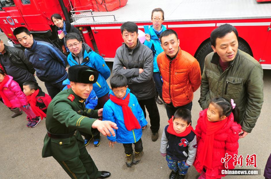 11月24日,父子搭档在参观消防设施。当日,辽宁省公安消防总队组织50对父子,以消防主题“老爸去哪儿”消防训练营活动。以父子搭档的形式体验、了解消防官兵的生活状态,加深市民对消防工作的认识。中新社发 于海洋 摄