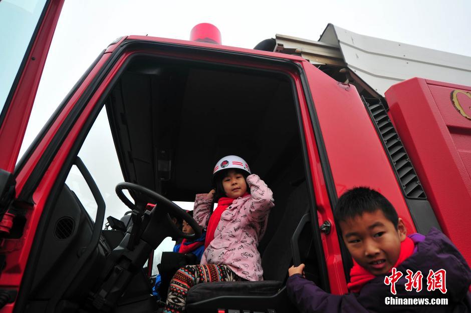 11月24日,小朋友在参观消防设施。当日,辽宁省公安消防总队组织50对父子,以消防主题“老爸去哪儿”消防训练营活动。以父子搭档的形式体验、了解消防官兵的生活状态,加深市民对消防工作的认识。中新社发 于海洋 摄