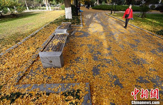 南京市玄武湖公园银杏树下遍地金,成“黄金大道”。泱波 摄