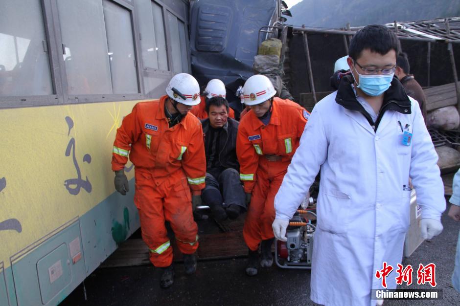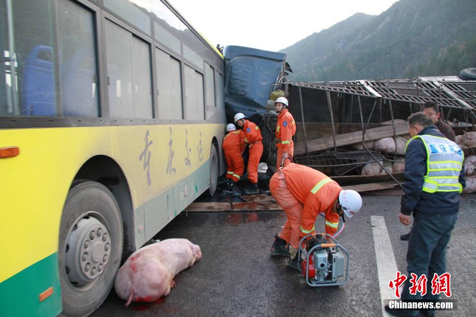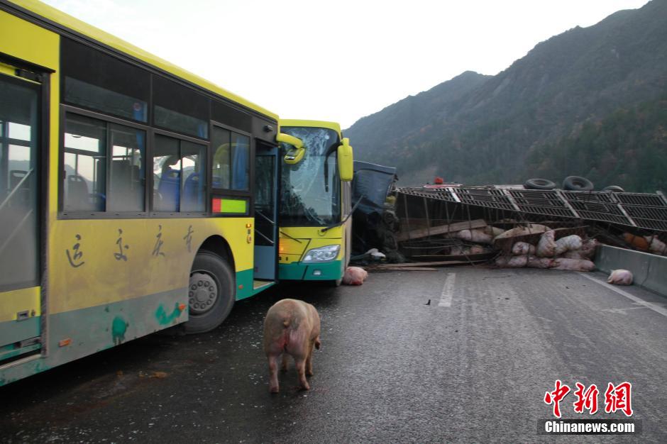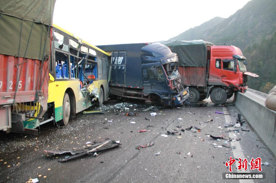 11月25日6时45分许,沪蓉高速重庆石柱县境内1513段发生8车连环追尾事故,其中包括1辆满载生猪的货车、1辆快递运输车、2辆集装箱货车和4辆崭新的公交车,所幸公交车上未载乘客。该事故现已造成2人死亡,1人受伤。据生猪货车司机贾先生称,他的车从收费站驶出后,突然发现前方3辆公交车发生追尾,因路面湿滑,他刹车不及撞上去,之后又有车辆撞上他的车。重庆高速公路管理局现对该路段实行间断放行,事故具体原因正在调查。图为事故现场。申建 摄