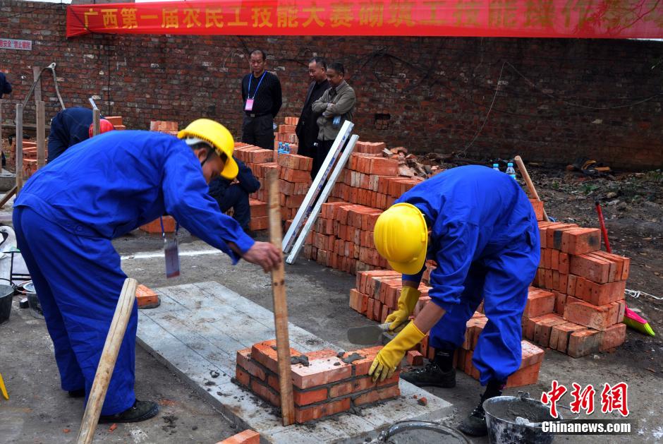 11月26日,广西首届农民工技能大赛在广西南宁市举行,154名农民工竞逐家政服务员、电焊工、工具钳工、钢筋工、砌筑工5个工种“技能状元”,图为建筑工人在比赛中。目前,中国有2亿多农民工,广西有800万名,广西既是劳务输出大省,也是农民工大省。中新社发 黄冬 摄