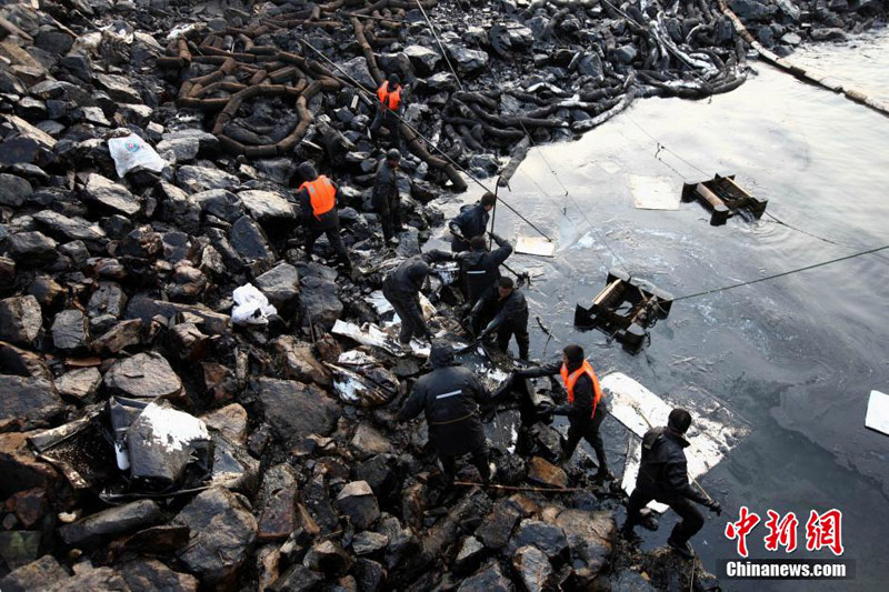 11月26日,在青岛市黄岛区油港附近,岸边的清污人员与海上的渔船正在收集海面油污。11.22中石化黄潍输油管道爆燃,有部分石油流入胶州湾。近几天来,青岛加大清污力度,清污效果明显,海面上已不见大面积油污,只剩少量油花,但岸边石头仍遗留油污。中新社发 徐崇德 摄