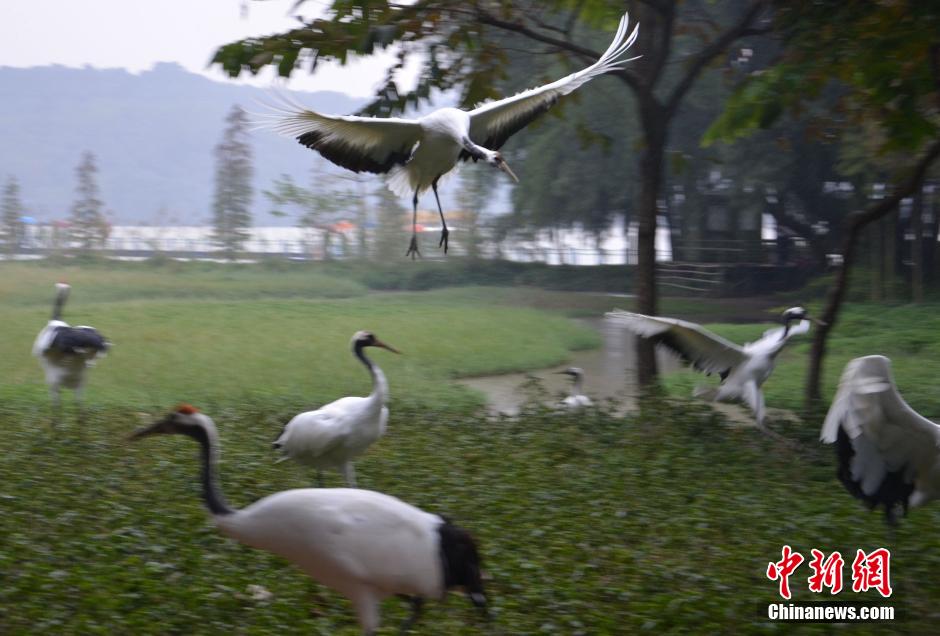 11月27日,广东星湖国家湿地公园在肇庆星湖揭牌,并现场启动今年肇庆星湖湿地冬季观鸟活动。目前止,中国内地共有298处试点建设的国家湿地公园,其中,32处通过验收获得正式“中国国家湿地公园”,“广东星湖国家湿地公园”是广东唯一一家通过国家验收的国家湿地公园。星湖湿地公园的高寒极地“湿地之神”丹顶鹤与非洲火烈鸟共栖被誉为“世界奇观”之一。图为湿地公园内的丹顶鹤。中新社发 黄耀辉 摄