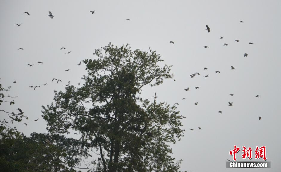 11月27日广东星湖国家湿地公园在肇庆星湖揭牌,并现场启动今年肇庆星湖湿地冬季观鸟活动。目前止,中国内地共  有298处试点建设的国家湿地公园,其中,32处通过验收获得正式“中国国家湿地公园”,“广东星湖国家湿地公园”是广东唯一一家通过国家验收的国家湿地公园。星湖湿地公园的高寒极地“湿地之神”丹顶鹤与非洲火烈鸟共栖被誉为“世界奇观”之一。图为漫天飞翔的成群鹭鸟。中新社发 黄耀辉 摄