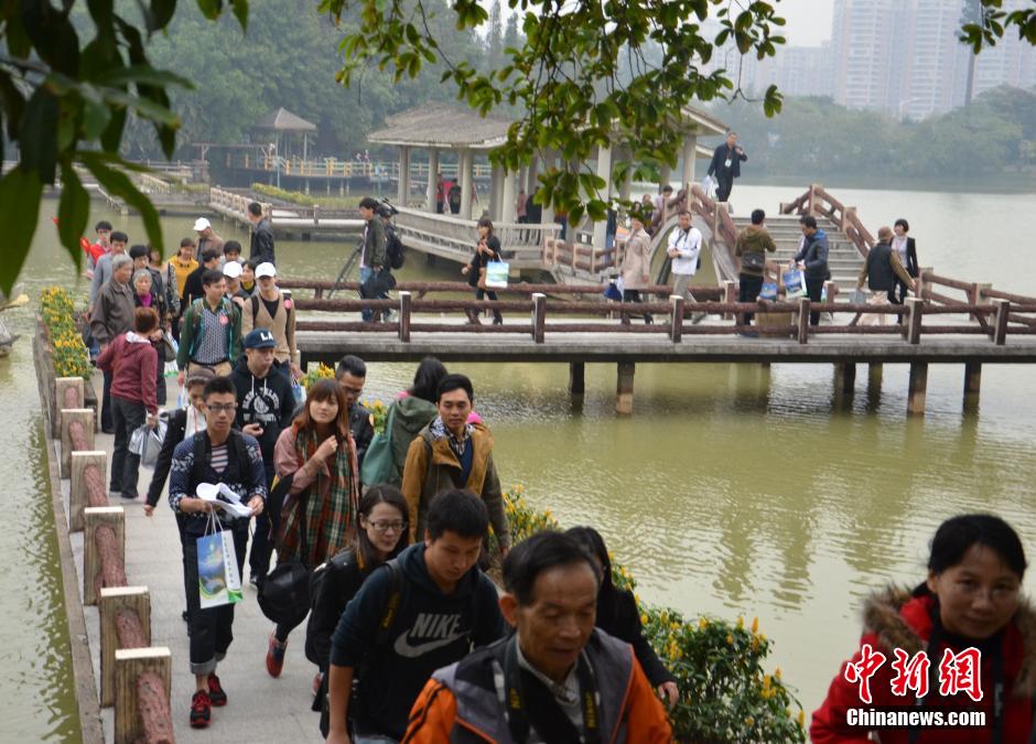 11月27日广东星湖国家湿地公园在肇庆星湖揭牌,并现场启动今年肇庆星湖湿地冬季观鸟活动。目前止,中国内地共有298处试点建设的国家湿地公园,其中,32处通过验收获得正式“中国国家湿地公园”,“广东星湖国家湿地公园”是广东唯一一家通过国家验收的国家湿地公园。星湖湿地公园的高寒极地“湿地之神”丹顶鹤与非洲火烈鸟共栖被誉为“世界奇观”之一。图为到湿地公园观鸟的人群。中新社发 黄耀辉 摄