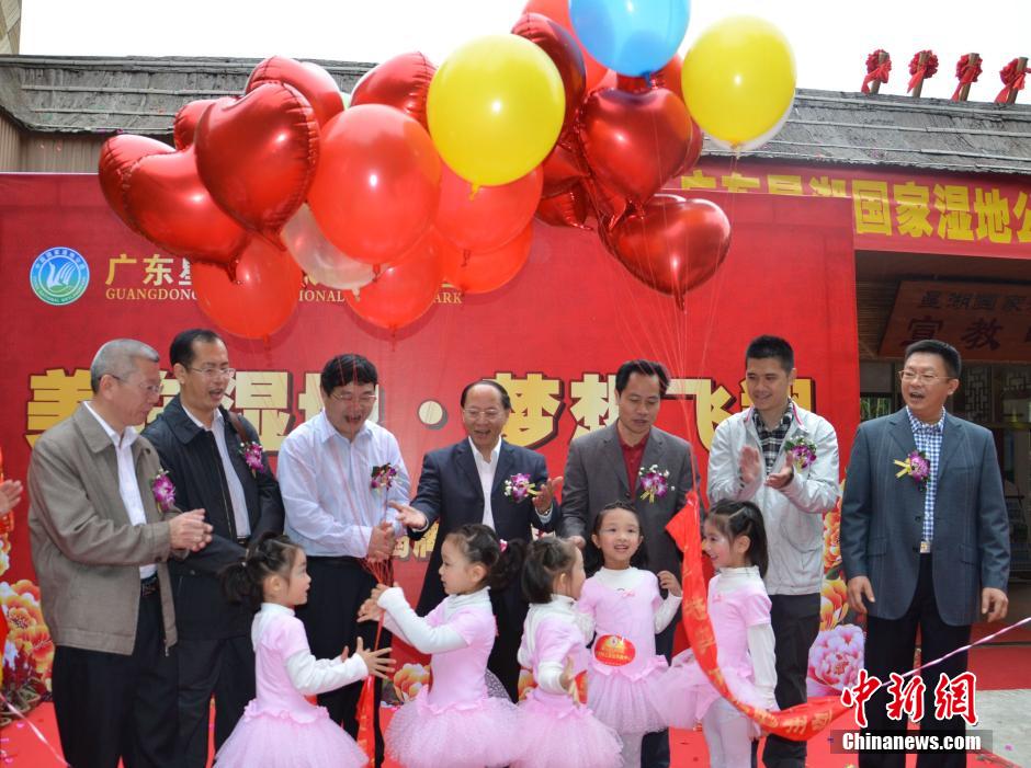 11月27日,广东星湖国家湿地公园在肇庆星湖揭牌,并现场启动今年肇庆星湖湿地冬季观鸟活动。目前止,中国内地共有298处试点建设的国家湿地公园,其中,32处通过验收获得正式“中国国家湿地公园”,“广东星湖国家湿地公园”是广东唯一一家通过国家验收的国家湿地公园。星湖湿地公园的高寒极地“湿地之神”丹顶鹤与非洲火烈鸟共栖被誉为“世界奇观”之一。图为广东星湖国家湿地公园揭牌现场。中新社发 黄耀辉 摄