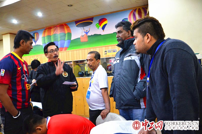 图为马来西亚全国银行雇员工会在赛前布置比赛任务。 (中工网记者 笑语摄)