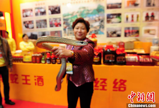 异蛇王酒的老板拿出活蛇在展位上推销产品。杨华峰 摄