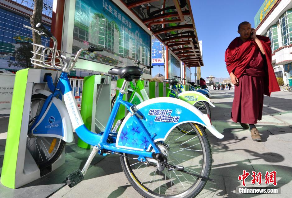 11月28日,拉萨市投放的公共自行车。目前,拉萨市在布达拉宫等十五处设置了公共自行车租赁点,总共投放了242辆公共自行车,受到了市民和游客的欢迎。未来,拉萨市还将继续增加公共自行车租赁点和自行车投放数量。中新社发 李林 摄