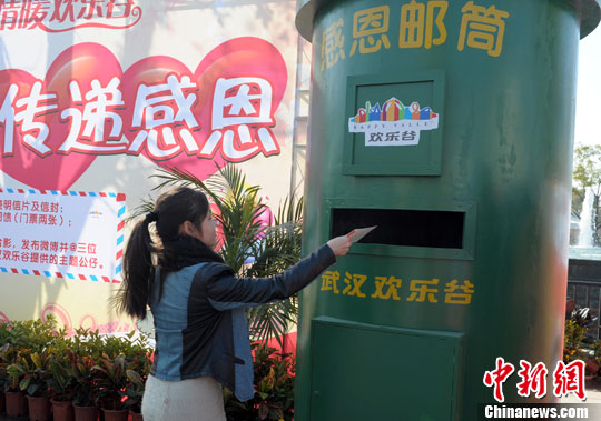 11月28日,正值西方的感恩节。武汉欢乐谷在喷泉广场设置了一个木制的感恩邮筒,游客们可以在获赠明信片写上感谢的话语和祝福,投递到邮筒里寄给自己最想感谢的人。中新社发 张畅 摄