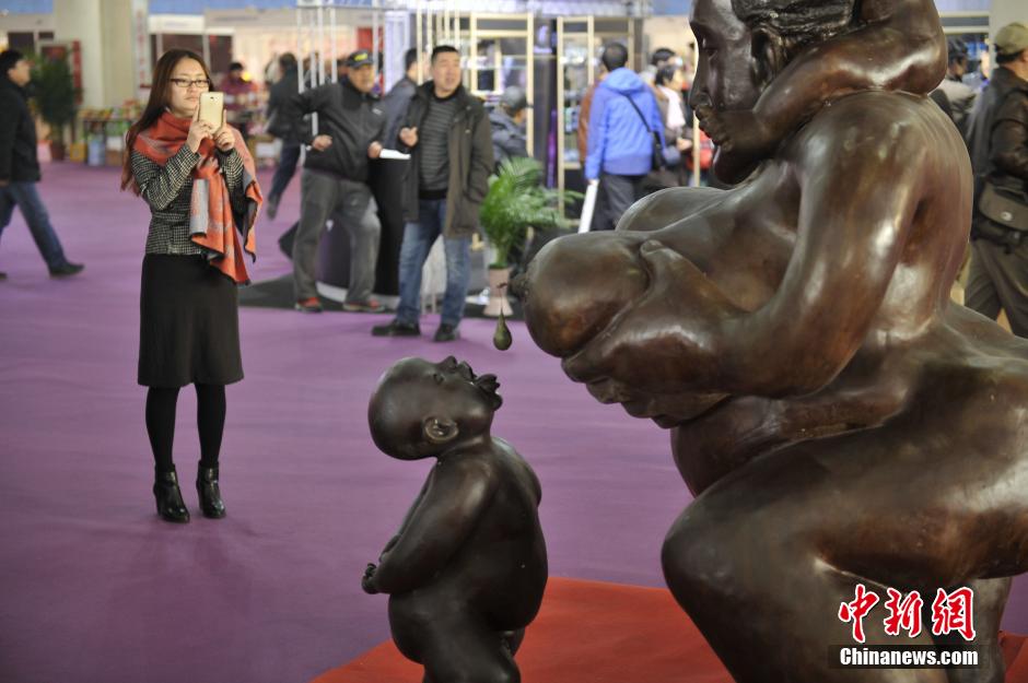 11月29日,天津,一名女性观众在一尊雕塑前拍照。当天,2013中国北方生殖健康成人用品博览会暨天津第二届性文化节开幕。中新社发 佟郁 摄