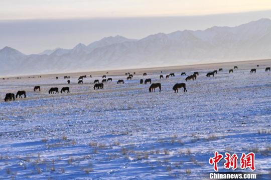 冬日的甘肃山丹马场草原上,马群、羊群在雪地里悠闲的觅食,夕阳斜照在它们的身上,勾勒出美丽的光环,牧羊人踏着夕阳赶着羊群走在回家的路上,这一切构成了一幅幅绝美的冬日牧归图。 陈礼 摄