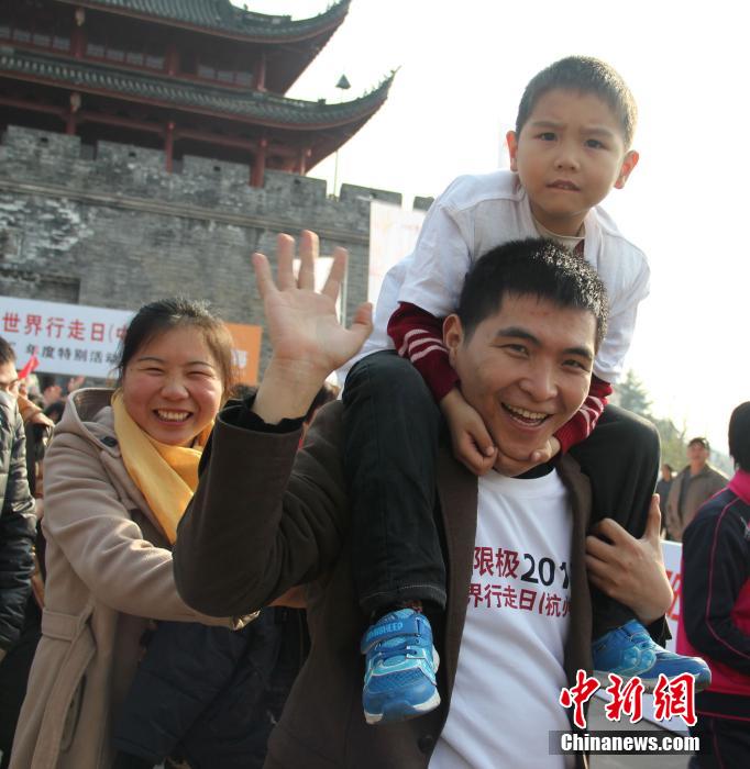 12月1日上午,无限极2013世界行走日(中国)活动在浙江宁海举行。来自上海、杭州、宁波、温州、台州及宁海等长三角地区的千名行走爱好者到场参与。作为面向全国开展的大型全民健身公益活动,世界行走日活动此前已连续举办三年,覆盖全国20多个重要城市,直接参加行走的人群累计超过70万人。而宁海站是2013年活动的最后一站。图为一家三口参与行走日活动。中新社发 林波 摄
