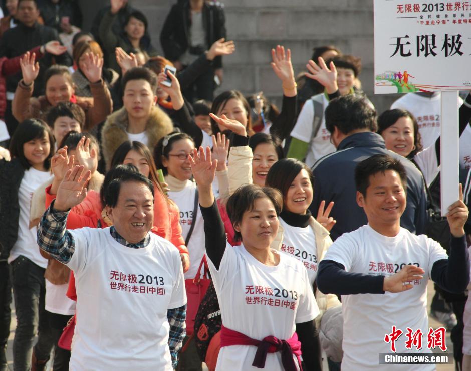 12月1日上午,无限极2013世界行走日(中国)活动在浙江宁海举行。来自上海、杭州、宁波、温州、台州及宁海等长三角地区的千名行走爱好者到场参与。作为面向全国开展的大型全民健身公益活动,世界行走日活动此前已连续举办三年,覆盖全国20多个重要城市,直接参加行走的人群累计超过70万人。而宁海站是2013年活动的最后一站。中新社发 林波 摄