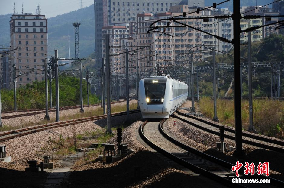 12月1日,连接深圳、汕头、厦门三个经济特区的厦深铁路全线试运行。厦深铁路全长502公里,为双线、电气化、国家一级客货运共线铁路,于2008年开工建设,2013年10月5日进入联调联试。试运行期间,厦深铁路开行不运载旅客试验动车组列车,进行列车运行图技术参数测试,列车员按布上岗。据试运行列车工作人员抵达深圳北站称,时速约200公里,运行时间约3小时30分,当日有11.5对列车空载试运行。中新社发 陈文 摄