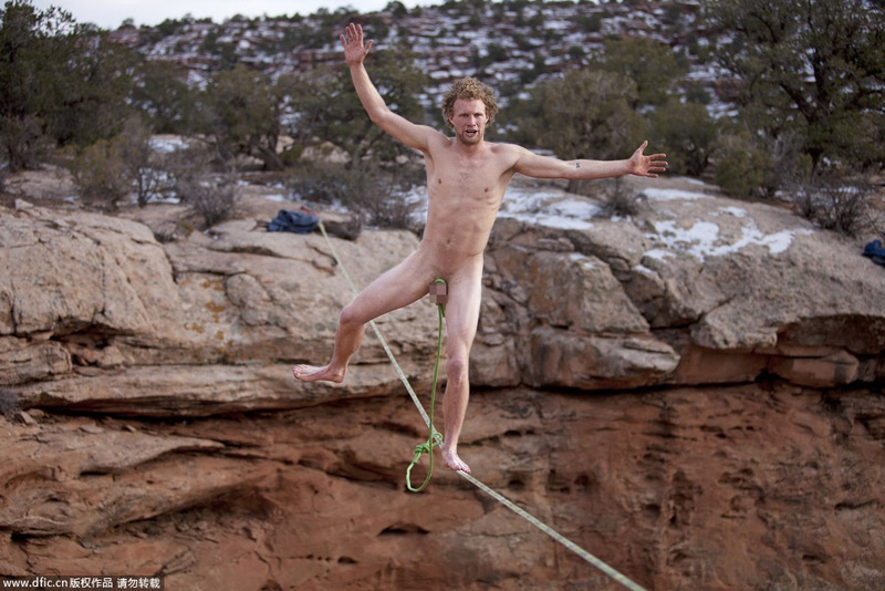 2013年11月27日报道,光是在离地面30米的高空中保持平衡还不够刺激,这群勇敢的冒险家们要挑战的是——裸体高空走扁带。他们把衣服脱在一边,沿着软绳穿过一段61米长的区域,只在腰间、脚踝,甚至是隐私部位系着一根安全带。这组让人大冒冷汗的照片是美国费城31岁摄影师Jared Alden在犹他州的沙漠中拍摄的。