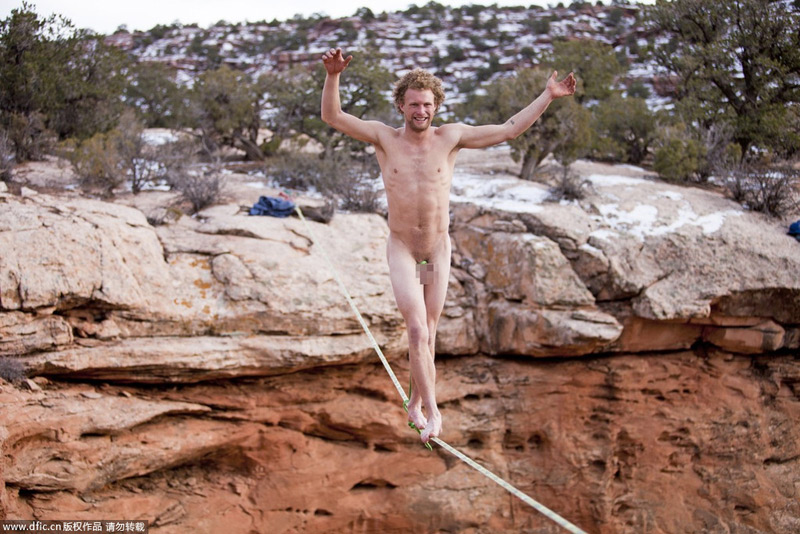 2013年11月27日报道,光是在离地面30米的高空中保持平衡还不够刺激,这群勇敢的冒险家们要挑战的是——裸体高空走扁带。他们把衣服脱在一边,沿着软绳穿过一段61米长的区域,只在腰间、脚踝,甚至是隐私部位系着一根安全带。这组让人大冒冷汗的照片是美国费城31岁摄影师Jared Alden在犹他州的沙漠中拍摄的。