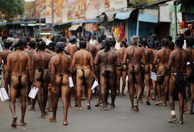 当地时间2013年12月2日,斯里兰卡科伦坡,农民们赤裸上身裹着缠腰布在大街上游行,分发传单,向公众表达对政府农业政策不利的失望。