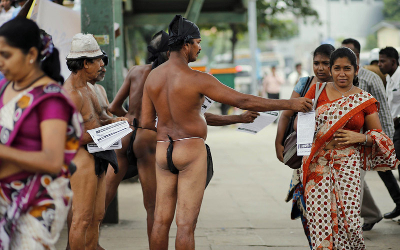 斯里兰卡农民半裸上街游行 发传单抗议政府管理不善