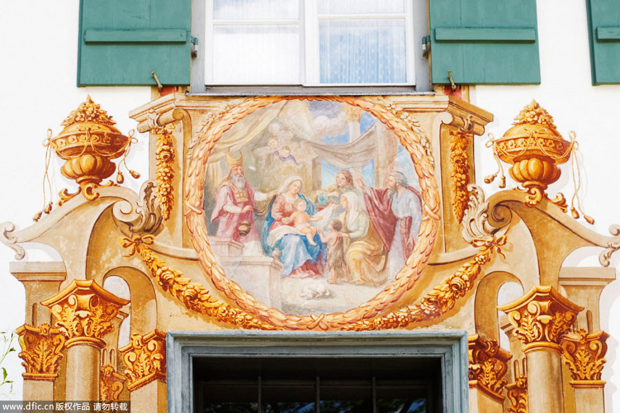 德国的奥伯阿玛高小镇被称作“壁画小镇”,小镇里大多是两到三层高的建筑物,在古朴的木屋墙壁上,用鲜艳的色彩画出一幅幅精美的壁画,取材极为广泛,宗教、神话、历史、民俗,无不入画。步入小镇,如同进入一个开放式的画廊,画中的人物栩栩如生,花卉图案精致细腻。居民对房子的每处细节都都加以修饰,门框窗楣边饰有一圈极富立体感的图案,有些房屋在墙上或转角还有耶稣或其它雕像,有着浓郁的宗教绘画风格。不仅如此,居民还喜欢种上色彩鲜艳的小花,无论是红砖铺就的欧式小镇街道、精美小店还是餐厅的两旁与窗台上,都装点着怒放的鲜花。从小镇教堂做完礼拜走出的居民,个个衣着考究,举止优雅,令人惊叹。