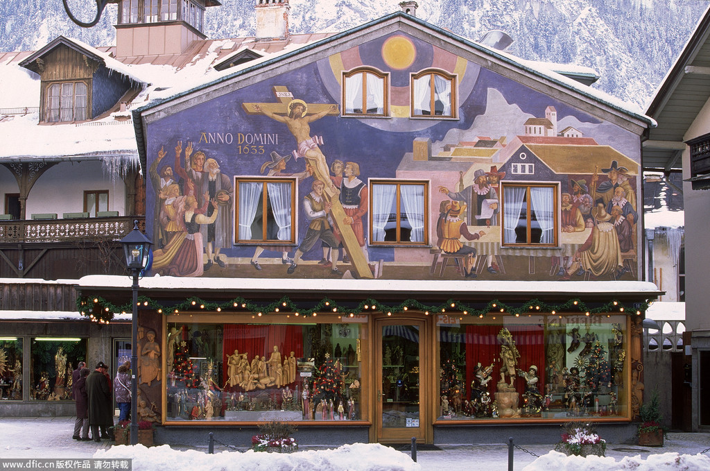 德国的奥伯阿玛高小镇被称作“壁画小镇”,小镇里大多是两到三层高的建筑物,在古朴的木屋墙壁上,用鲜艳的色彩画出一幅幅精美的壁画,取材极为广泛,宗教、神话、历史、民俗,无不入画。步入小镇,如同进入一个开放式的画廊,画中的人物栩栩如生,花卉图案精致细腻。居民对房子的每处细节都都加以修饰,门框窗楣边饰有一圈极富立体感的图案,有些房屋在墙上或转角还有耶稣或其它雕像,有着浓郁的宗教绘画风格。不仅如此,居民还喜欢种上色彩鲜艳的小花,无论是红砖铺就的欧式小镇街道、精美小店还是餐厅的两旁与窗台上,都装点着怒放的鲜花。从小镇教堂做完礼拜走出的居民,个个衣着考究,举止优雅,令人惊叹。