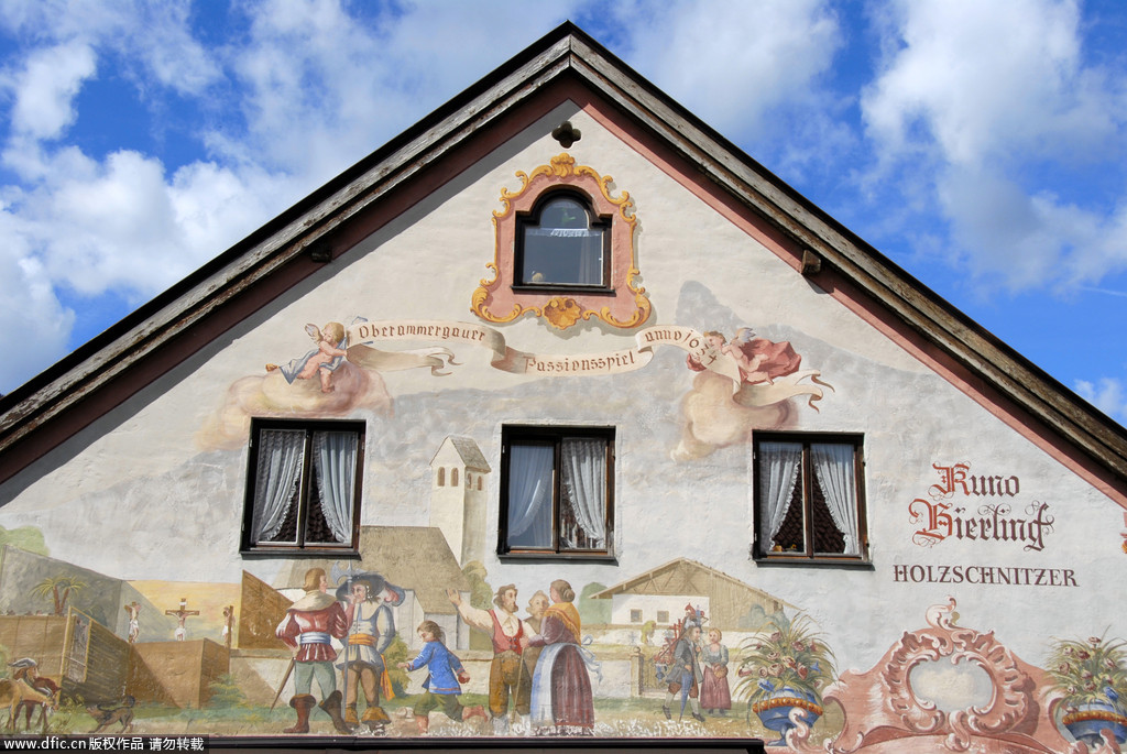 德国的奥伯阿玛高小镇被称作“壁画小镇”,小镇里大多是两到三层高的建筑物,在古朴的木屋墙壁上,用鲜艳的色彩画出一幅幅精美的壁画,取材极为广泛,宗教、神话、历史、民俗,无不入画。步入小镇,如同进入一个开放式的画廊,画中的人物栩栩如生,花卉图案精致细腻。居民对房子的每处细节都都加以修饰,门框窗楣边饰有一圈极富立体感的图案,有些房屋在墙上或转角还有耶稣或其它雕像,有着浓郁的宗教绘画风格。不仅如此,居民还喜欢种上色彩鲜艳的小花,无论是红砖铺就的欧式小镇街道、精美小店还是餐厅的两旁与窗台上,都装点着怒放的鲜花。从小镇教堂做完礼拜走出的居民,个个衣着考究,举止优雅,令人惊叹。