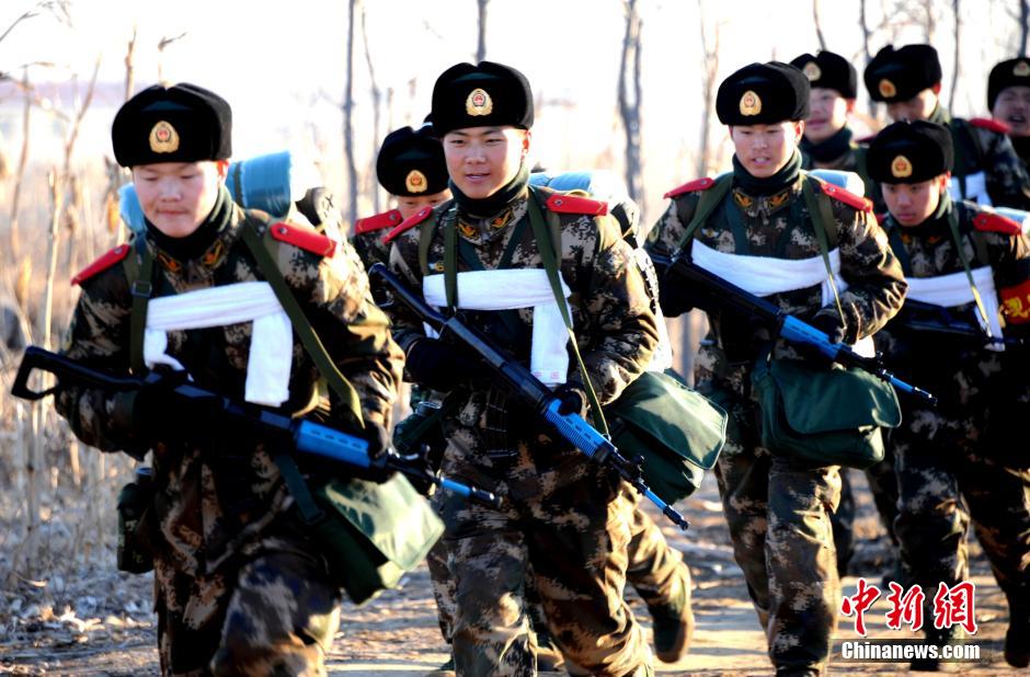 12月6日8时,随着一颗红色信号弹升起,武警辽宁总队数千名新兵拉开冬季野营拉练序幕。图为拉练第一天现场。中新社发 吴成钢 摄