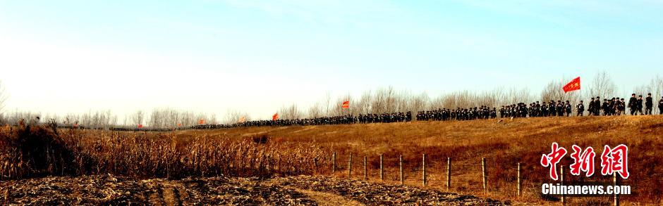 12月6日8时,随着一颗红色信号弹升起,武警辽宁总队数千名新兵拉开冬季野营拉练序幕。图为拉练第一天现场。中新社发 吴成钢 摄