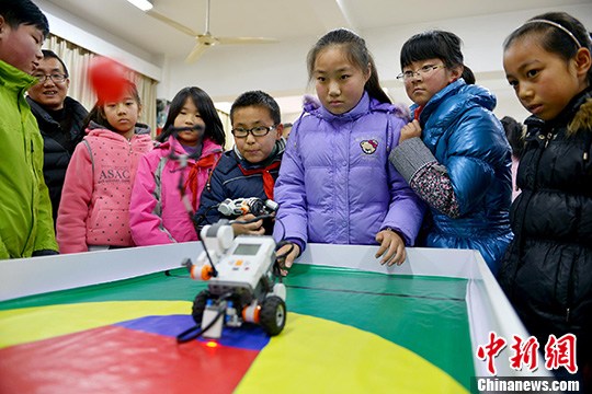 12月11日上午,“2013年小学机器人教学观摩研讨活动”在无锡市通德桥实验小学举行。小学生们以团队形式进行比赛,通过为机器人编写程序,操控其进行投篮。中新社发 李一芳 摄