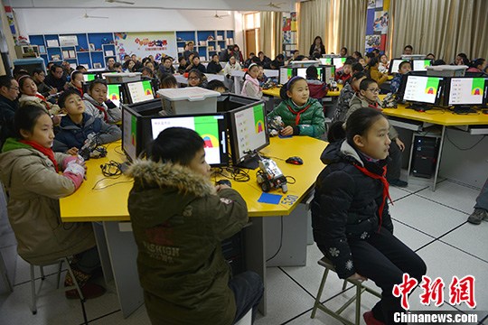 12月11日上午,“2013年小学机器人教学观摩研讨活动”在无锡市通德桥实验小学举行。小学生们以团队形式进行比赛,通过为机器人编写程序,操控其进行投篮。中新社发 李一芳 摄