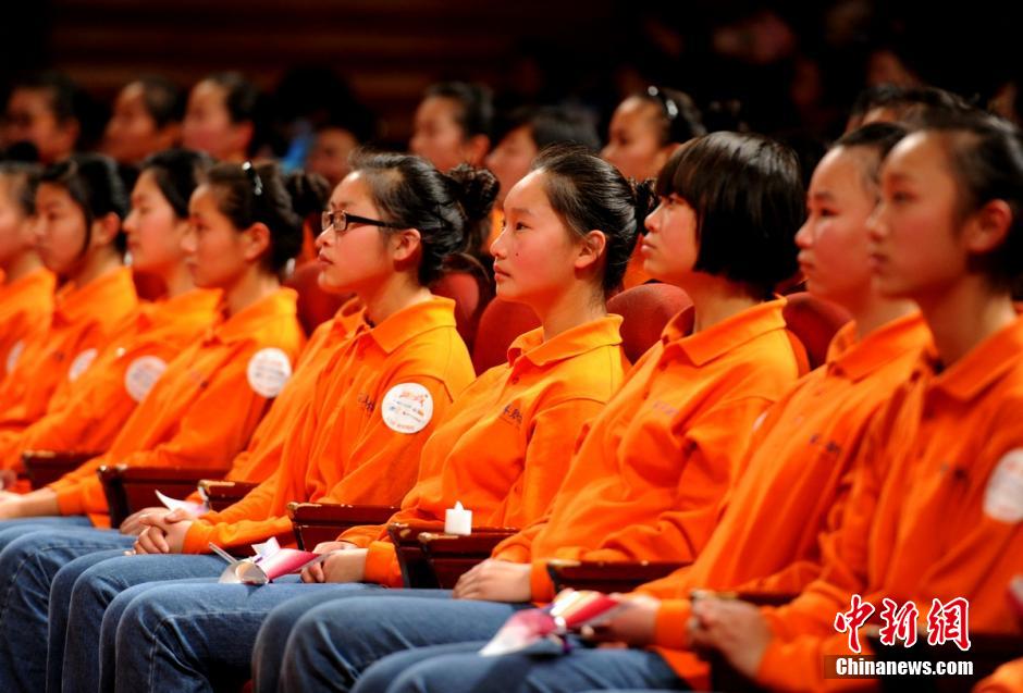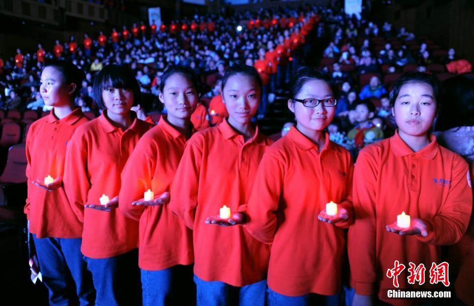 12月10日晚,“2013温暖之城”公益系列活动之“有爱同行感恩音乐会”拉开序幕,《欢乐颂》、《巴扬手风琴》、《卡门序曲》等精彩乐曲给观众带来了一场视听盛宴。图为成都百年职校的孩子们传递点亮“爱心灯”。刘忠俊 摄