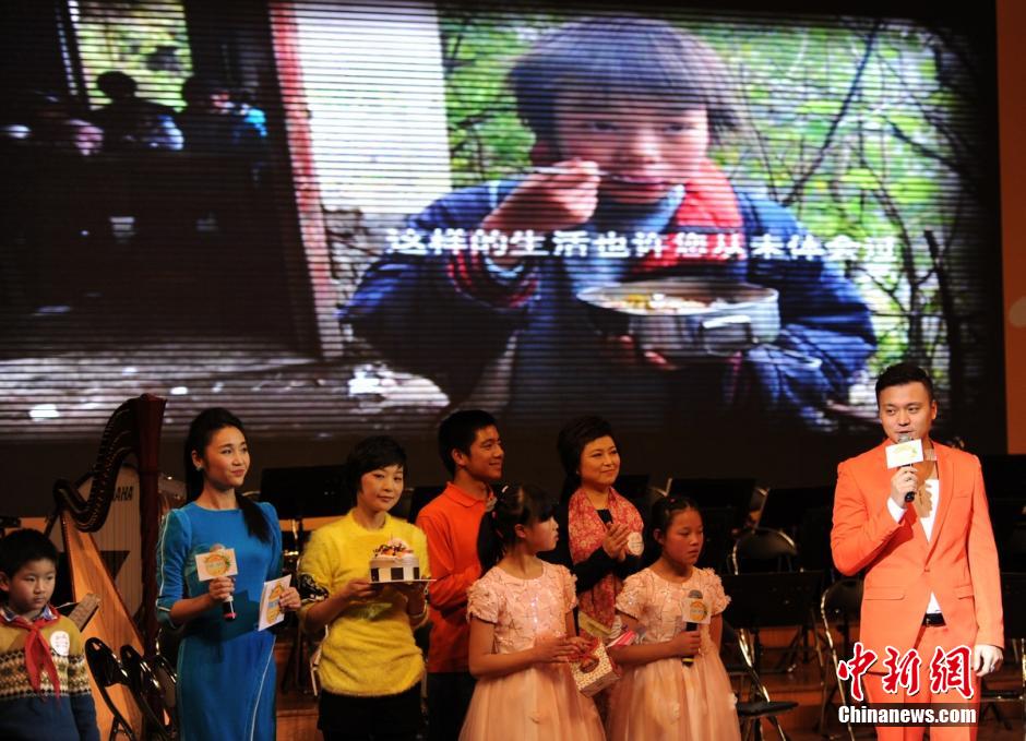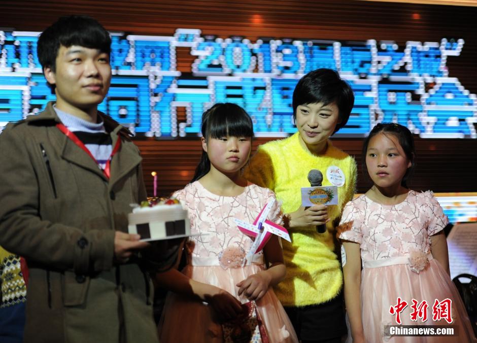 12月10日晚,“2013温暖之城”公益系列活动之“有爱同行感恩音乐会”拉开序幕,《欢乐颂》、《巴扬手风琴》、《卡门序曲》等精彩乐曲给观众带来了一场视听盛宴。图为网友为古蔺县大山里的留守孩子郭庆丹(左)送上生日蛋糕。刘忠俊 摄