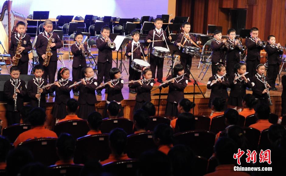 12月10日晚,“2013温暖之城”公益系列活动之“有爱同行感恩音乐会”拉开序幕,《欢乐颂》、《巴扬手风琴》、《卡门序曲》等精彩乐曲给观众带来了一场视听盛宴。图为成都人北小学学生管乐队正在表演。刘忠俊 摄