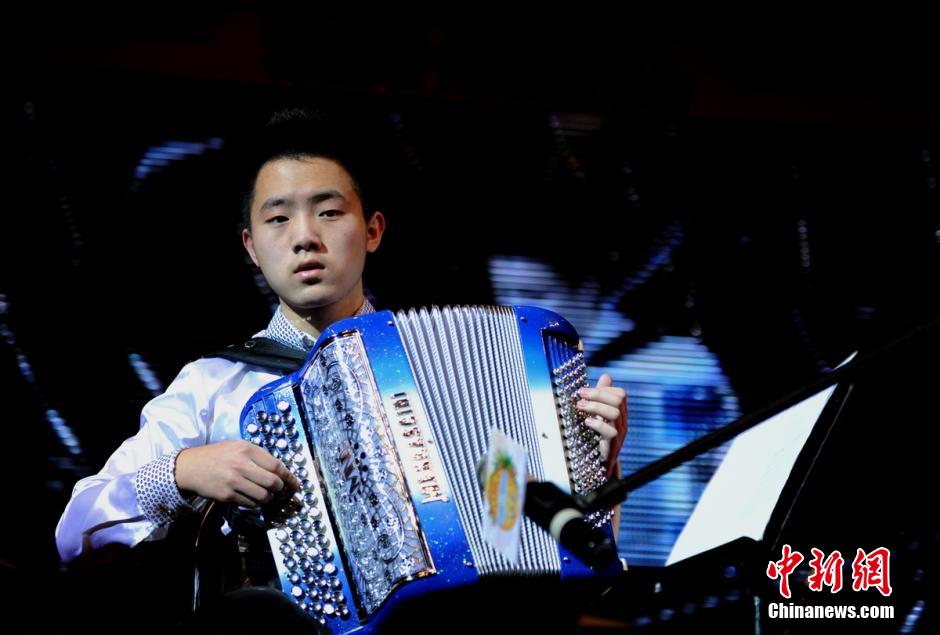 12月10日晚,“2013温暖之城”公益系列活动之“有爱同行感恩音乐会”拉开序幕,《欢乐颂》、《巴扬手风琴》、《卡门序曲》等精彩乐曲给观众带来了一场视听盛宴。图为中国手风琴俱乐部的顾寻现场演绎手风琴独奏《枫之舞》。刘忠俊 摄