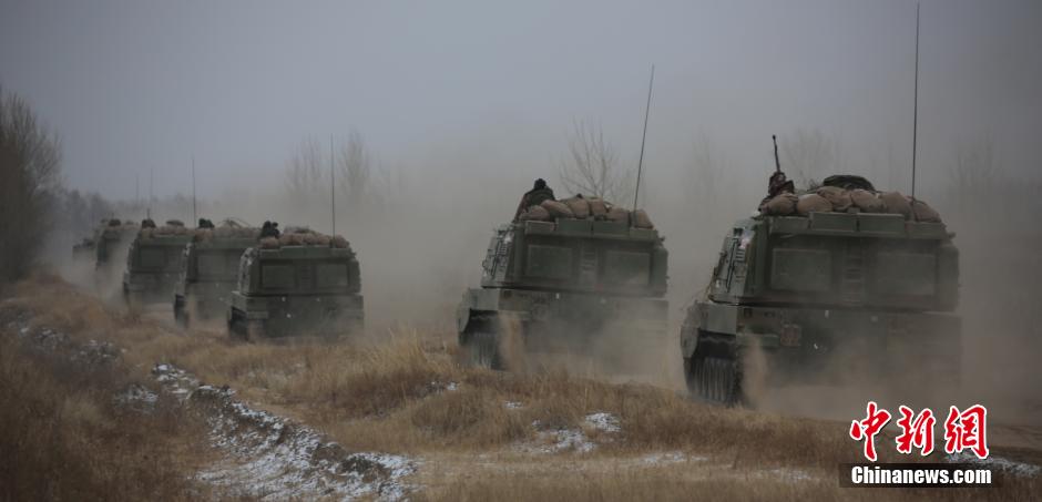 12月10日,沈阳军区某机械化师炮兵团远程机动到科尔沁草原深处,参加集团军组织的冬季实兵演习,锤炼严寒条件下的作战能力。中新社发 李祥辉 摄